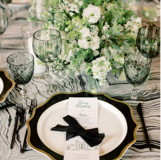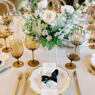 The table setting in the light room was a stunning mix of white and shades of green green. There was a full gold place setting, and the wine glasses were a deep, burnt amber color.