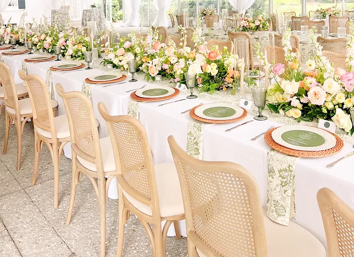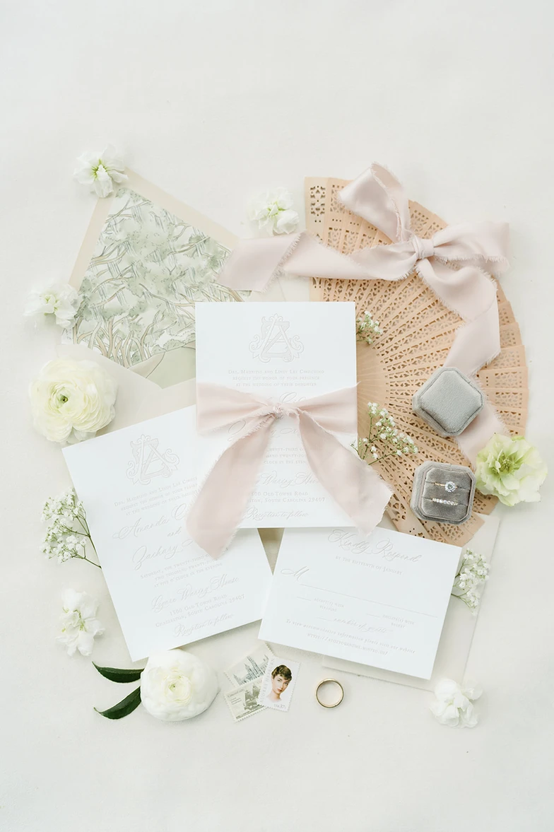 Often used in the background of detail shots, rattan decor pairs beautifully with any color invitation, shoe, flower, or anything else your photographer includes in the shot! The natural tones of rattan contrast with floral arrangements and tableware, making colors pop and adding depth to each image. Photographers can play with the intricate patterns and shapes, capturing the delicate interplay of light and shadow. From rings displayed on a rattan tray to handheld rattan fans, incorporating rattan decor not only elevates the visual appeal but also tells a story of natural elegance, making each detail shot truly memorable.