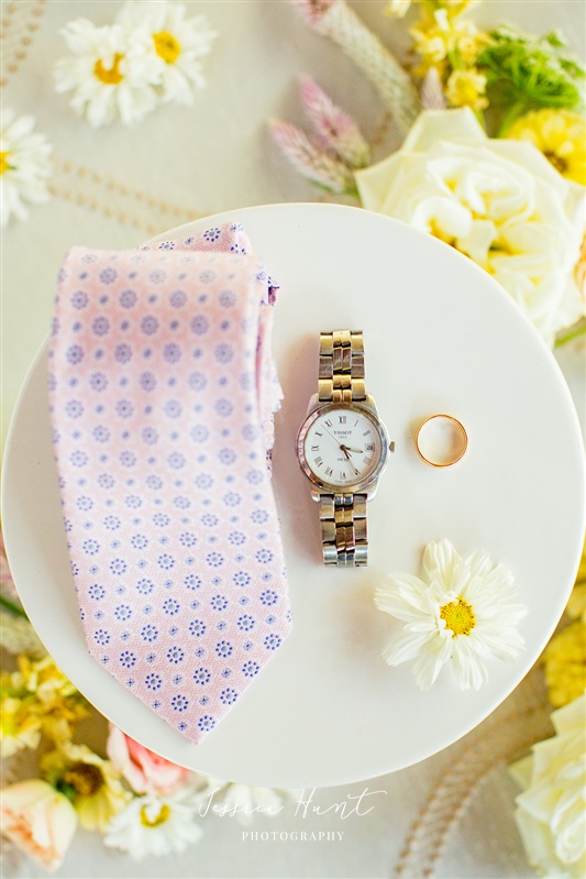 GROOM: his shoes, tie, jacket, boutonniere, cufflinks, watch, florals, the full ring set, and any special details"
