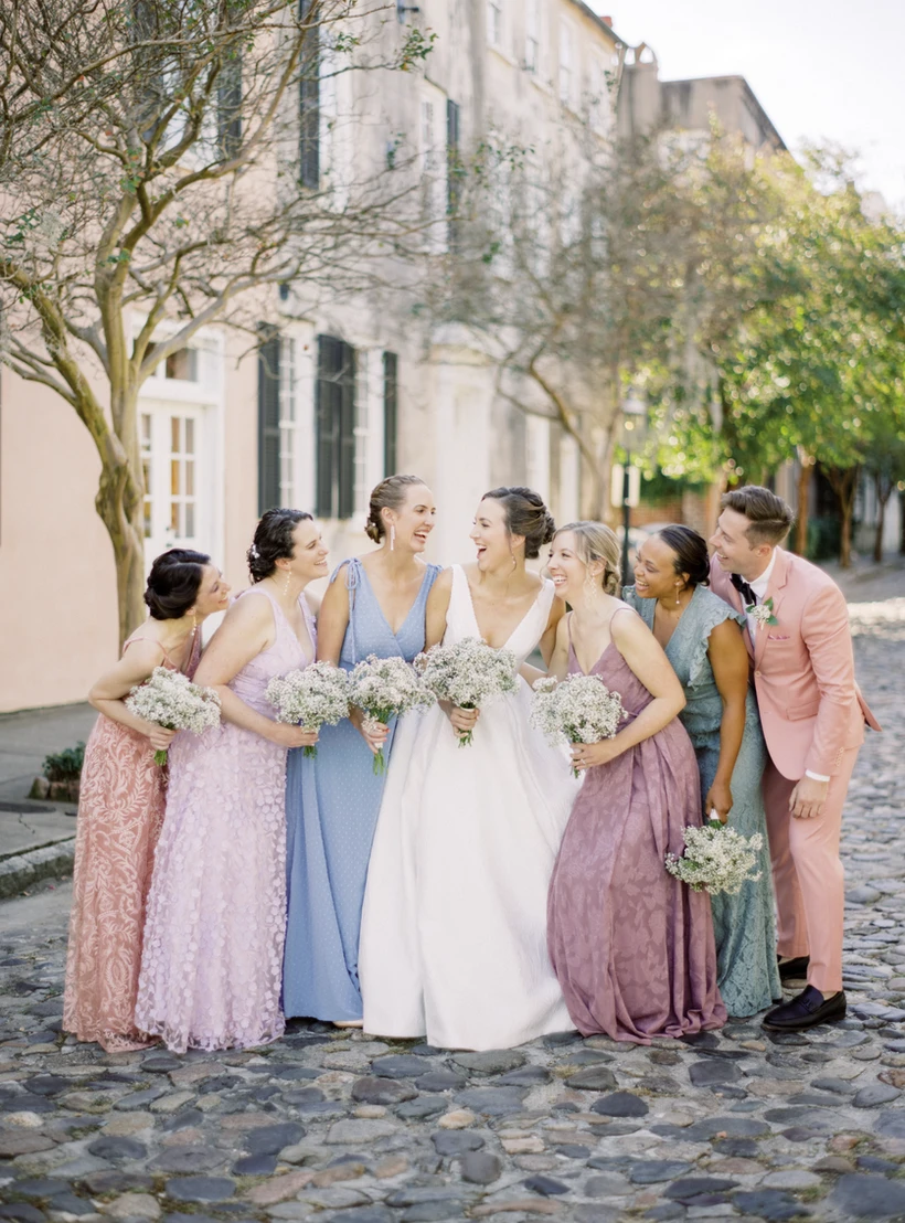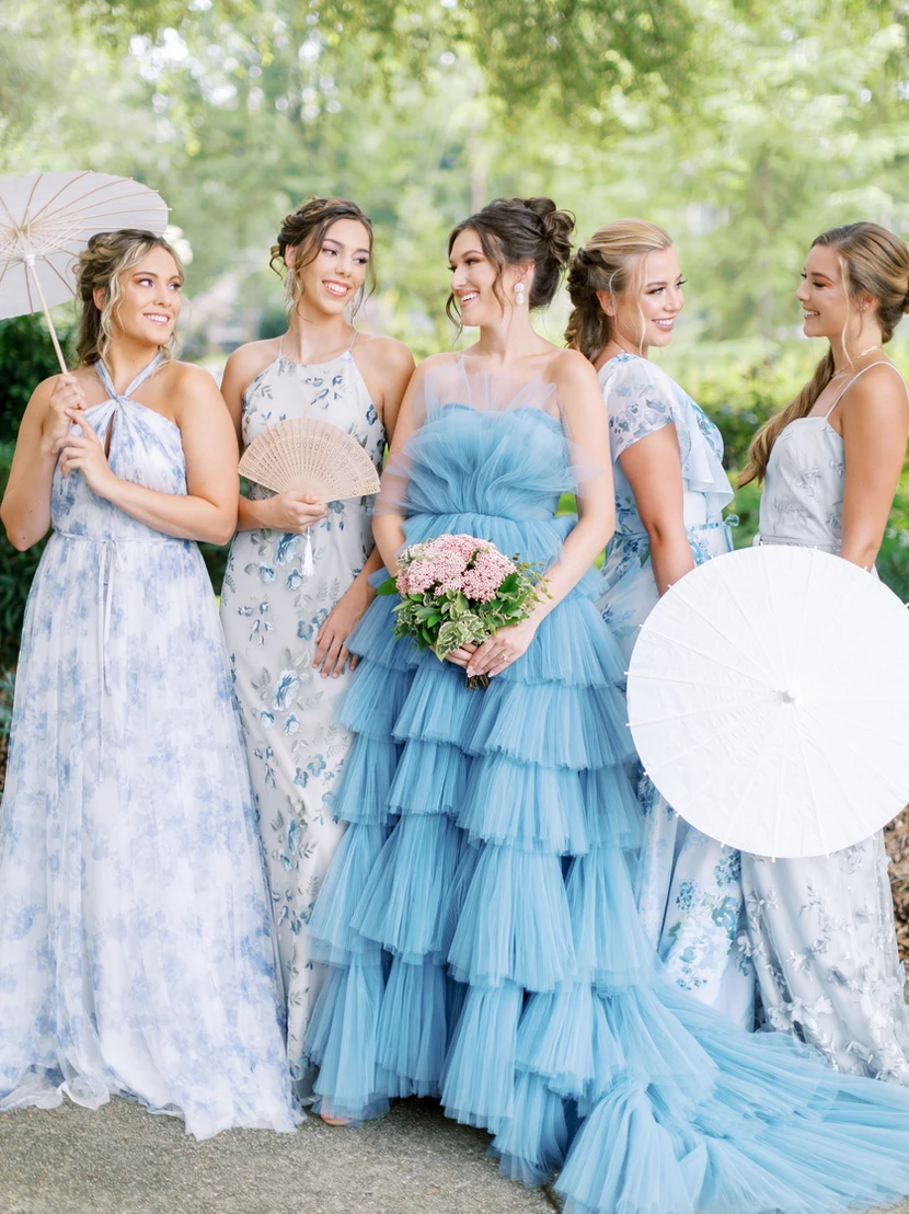 We are seeing brides steer away from the traditional matching bridesmaid dresses. We have recently seen bridal parties in different dresses but with the same color palette. Having nonmatching bridesmaid dresses allows more of a variety of color shades, textures, and patterns. It creates an eclectic and unique look for wedding parties.